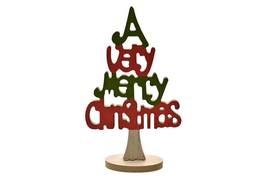 Decoração Árvore Madeira 21cm “A Very Merry Christmas”, feito em madeira, altura 21cm, comprimento 21cm, largura 4.5cm. O centro tem 35cm de comprimento e 14cm de largura.