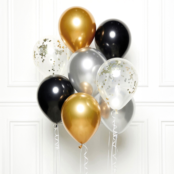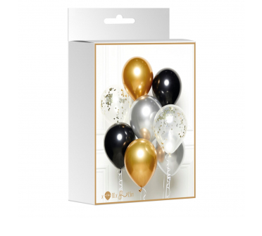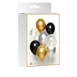 - Estão incluídos 8 balões de látex clássicos, 2 x dourado, 2 x preto, 2 x prateado e 2 x transparente com confetis.