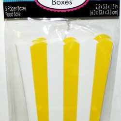 Apresentando bordas recortadas clássicas e riscas amarelas e brancas, as nossas caixas de guloseimas para pipoca medem 6,3 cm x 13,4 cm x 3,8 cm.