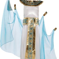 Fantasia infantil de Cleópatra para meninas apresenta um vestido de marfim sedoso com um cinto dourado e turquesa, uma gola metálica dourada e turquesa e um cocar real.