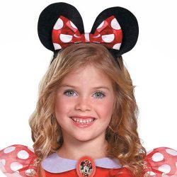 Uma faixa preta com orelhas da Minnie Mouse no topo e um laço vermelho fino com bolinhas brancas brilhantes.