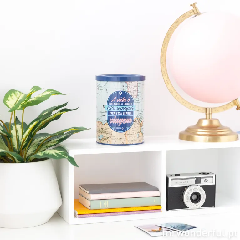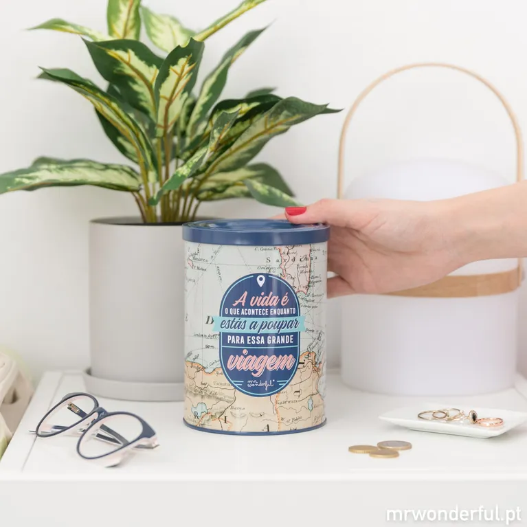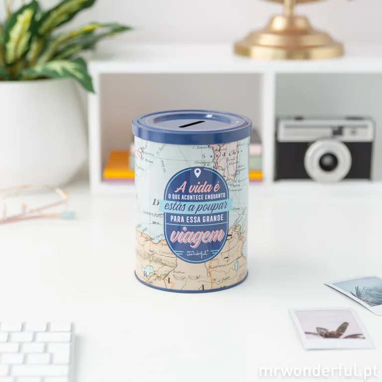 Mealheiro de alumínio com mensagem motivadora para poupar para viajar.