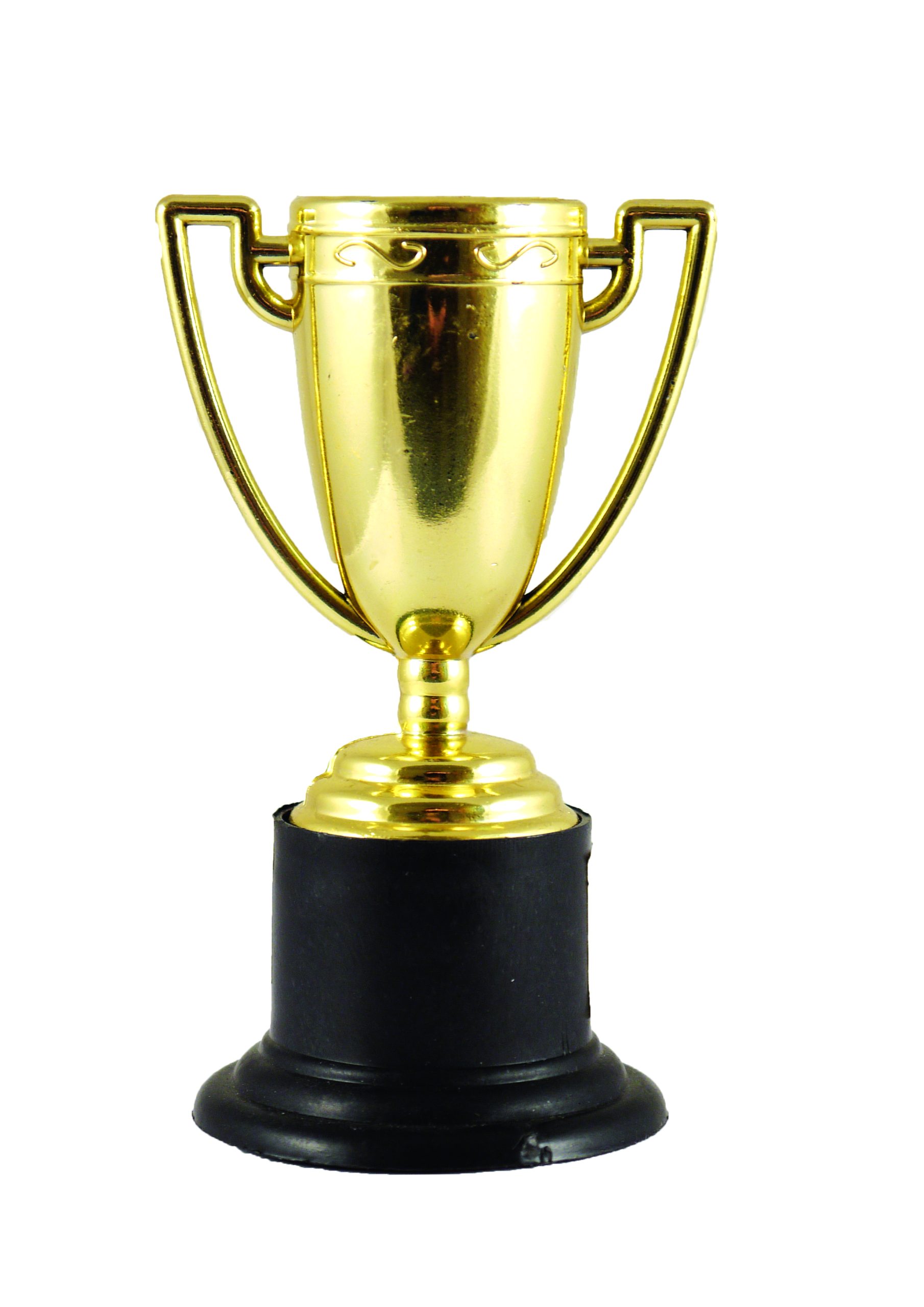 Mini troféu de plástico de cor dourada, ideal para festas de aniversário temáticas e oferecer como brinde em temas de Futebol ou outros.