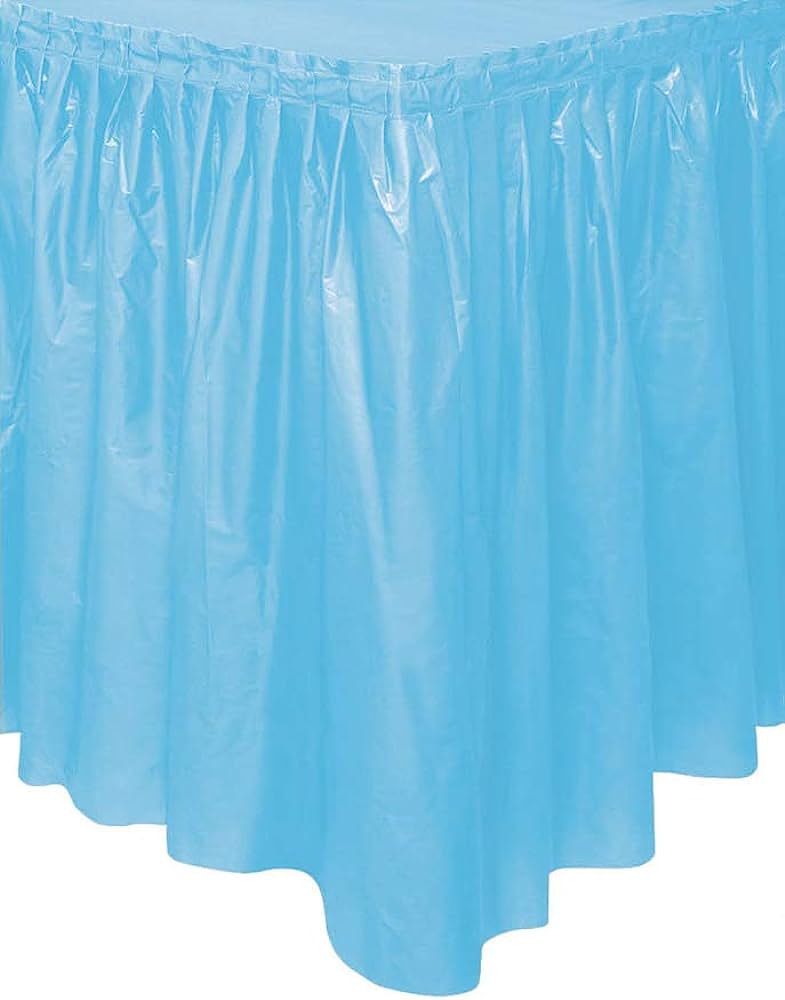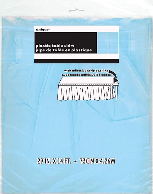 - A saia de mesa azul bebé mede 4,3 m x 74 cm)e pode ser cortada para caber