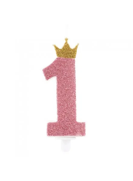 Vela Aniversário Rosa Número 1 com Coroa e Glitter